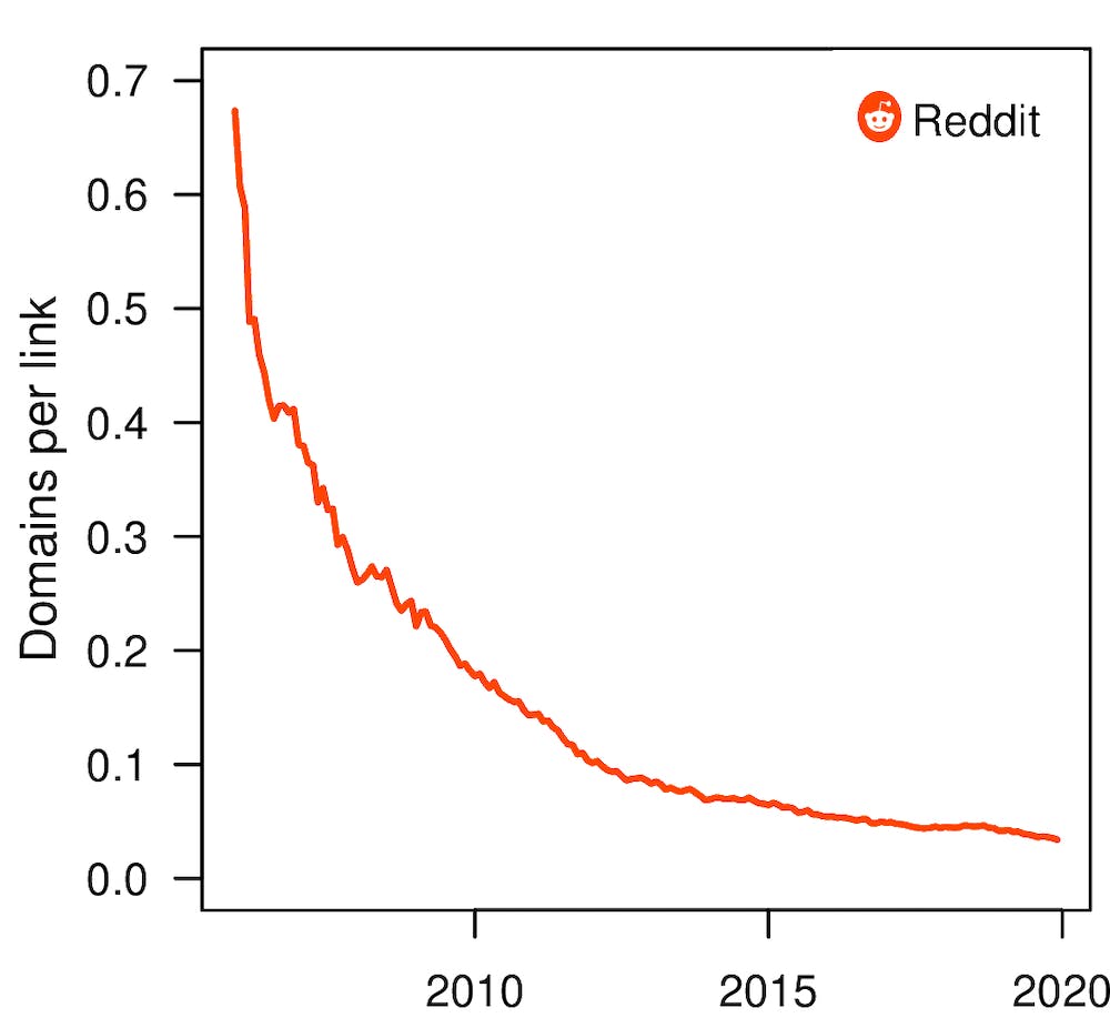 A decade ago, there was a much greater variety of domains within links posted by users of Reddit, with more than 20 different domains for every 100 random links users posted. Now there are only about five different domains for every 100 links posted.